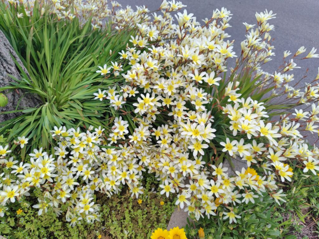 今日、散歩途中で同じ花を見つけたので、グーグルレンズで調べてみたら、「スパラキシス」と、出ました。↓