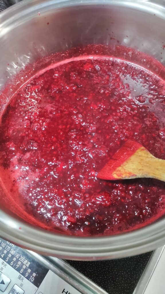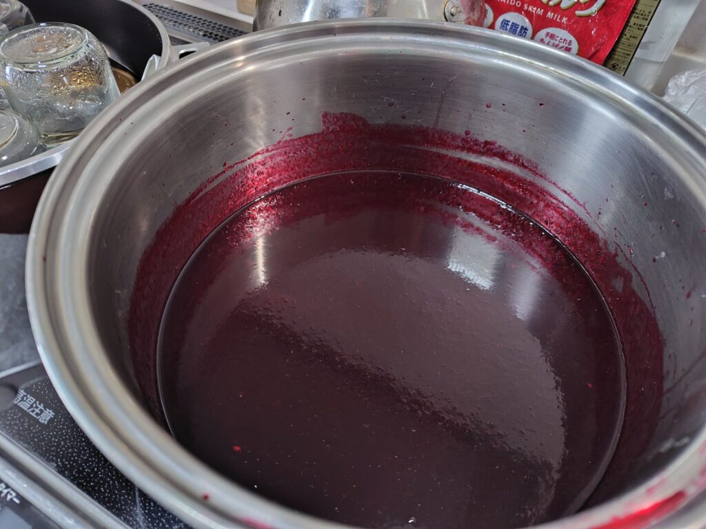 で、種を除いたブラックベリー液に砂糖を加えて煮詰めます。