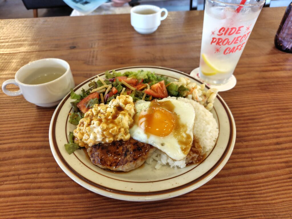 いつもと違う味を求めて「sideprojectcafe」という、とってもアメリカンなお店で「テリタルロコモコプレート」1600円をいただきました。アラ古希夫婦、いつもと違う雰囲気のお店のボリュームと味に大満足!とってもおいしかったです。