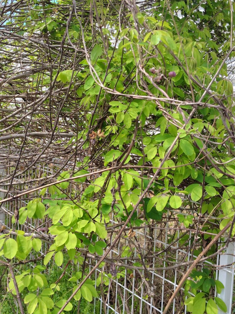 ツルを伸ばして、確かにアケビの芽はありましたが、新潟の山で雪を越したアケビとは違うので、こちらでは見守るだけにします。