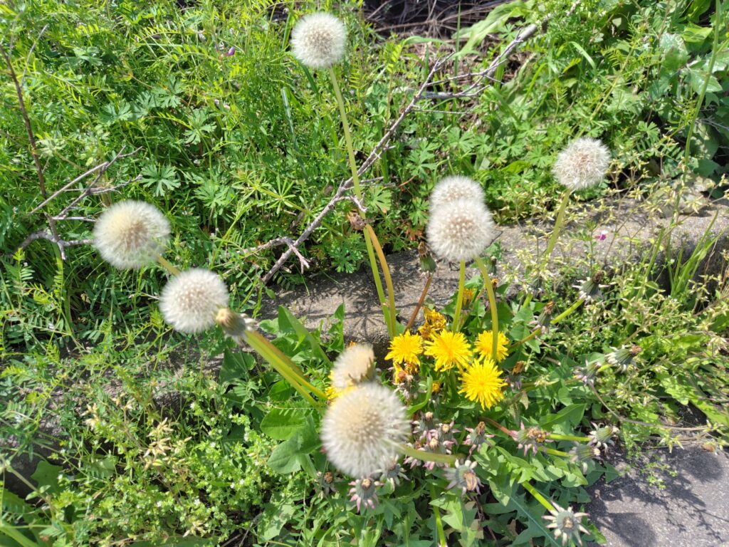 道端のタンポポは、すでに綿毛になっているものも ↓
