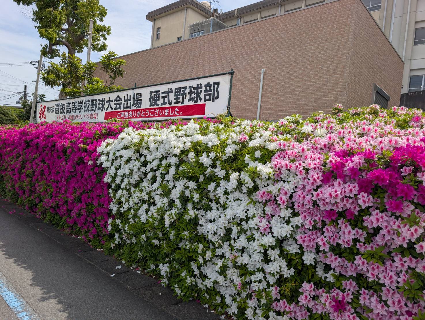 昨日のお散歩途中の、三重高校のツツジの生け垣です。甲子園応援ありがとうの横断幕もかかっています。色とりどり、綺麗です。↑
