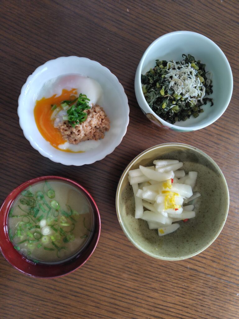例の(10月29日付けブログ)温泉卵と納豆、昨日紹介した大根葉のふりかけ、うちの大根のゆず大根、そして味噌汁は夏前に収穫したジャガイモ入りです。