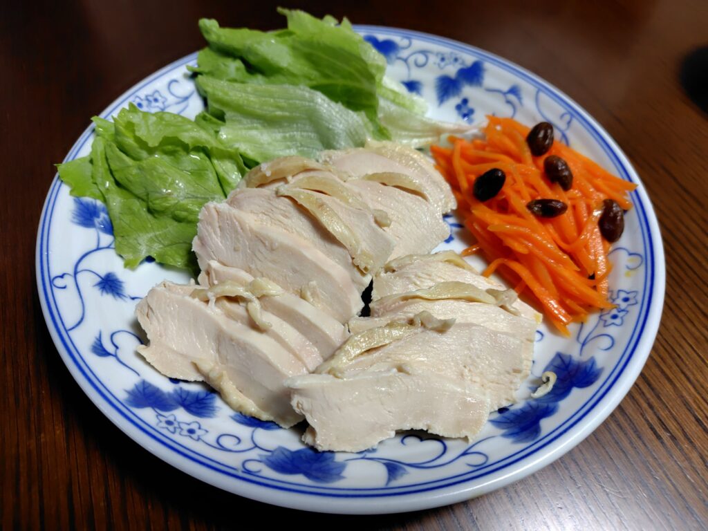 低温調理でゆるゆると茹でると、シットリ柔らかい「サラダチキン」ができるそうですが、高齢者の私は生茹でがこわいので、しっかり茹でます。