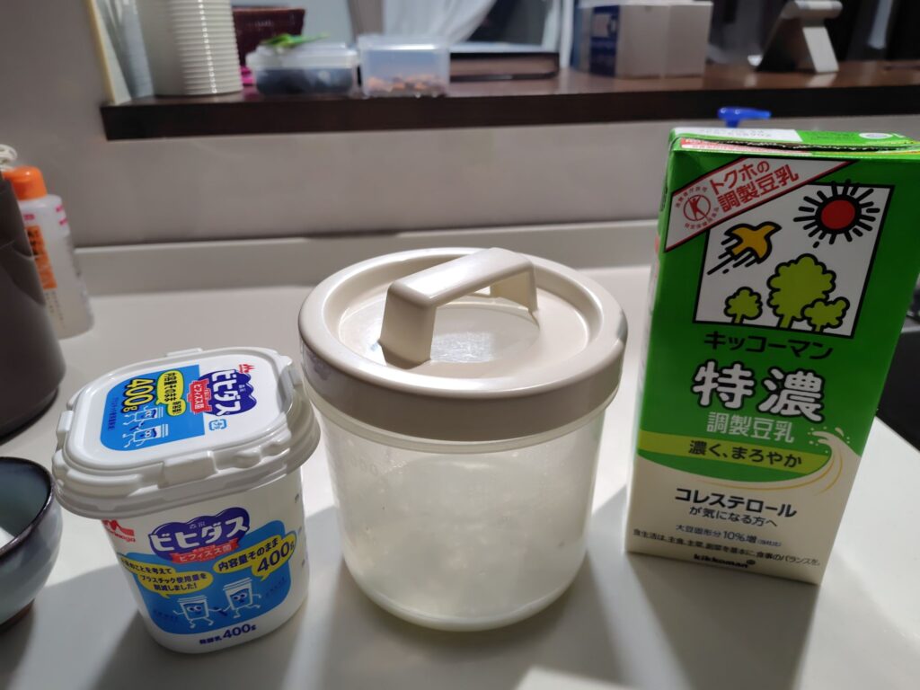 豆乳1Lに、種用のヨーグルト100g位(これぐらいの乳製品は大丈夫)