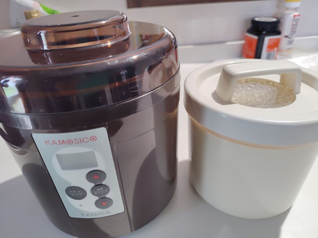 もう10年近く愛用しているこのメーカーに入れて ↑ 40度で7時間、たっぷりの豆乳ヨーグルトができました。
