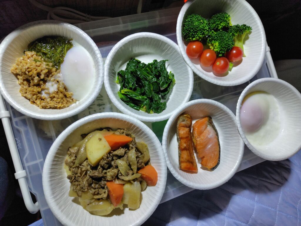 そして、車中泊飯は、毎回1~2日分は家の残り物を持参します。昨日と同じですが…